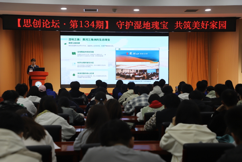 思创论坛现场座无虚席,赵亚杰以“守护湿地瑰宝,共筑美好家园”为主题,分享了自己扎根黄河三角洲湿地十二年的守护历程。她借助实景图片,带领学子了解黄河三角洲地质演化与湿地生态风貌,生动讲述东方白鹳、黑嘴鸥等376种鸟类栖息繁衍的动人场景,展现了湿地守护者日复一日的坚守。她结合工作实际,剖析了水资源短缺、互花米草入侵等湿地保护难题,也分享了保护区通过引蓄黄河水、开展生态修复,助力黄河口入选世界自然遗产的实践成果。